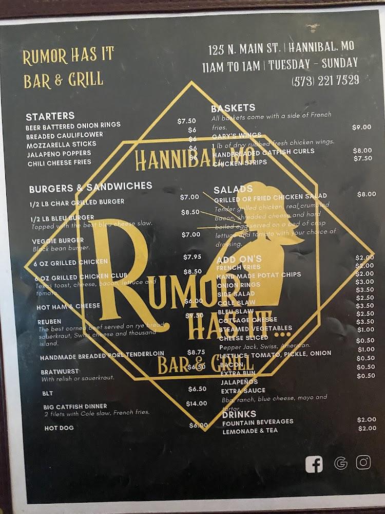 Welcome to Rumor Has It... Bar & Grill, your ultimate destination for sports, great food, and vibrant nightlife in Hannibal, MO. Located at 125 N Main St, our lively establishment proudly offers a diverse menu featuring delicious grilled dishes, an impressive selection of cocktails, and a vast array of beers. Enjoy our welcoming atmosphere while catching the latest games, participating in karaoke, or dancing the night away at our weekend events. With accessible seating and a cozy outdoor terrace, we invite groups and solo diners alike to experience exceptional service and unforgettable entertainment. Come join the fun!